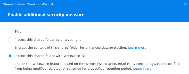 Do not mix with “Immutable Snapshots” that is something else – prevents snapshots from being deleted. We are dealing here with files on a file share that are immutable for some time period. Here we will describe the process on Synology devices that support WORM (not all of them are).